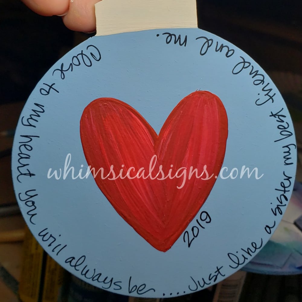Round wooden ornament measuring 5" across. Painted in a soft french blue the saying around the edge is "Close to my heart you will always be...just like a sister my best friend and me". The names of you and your best friend are hand lettered in black on the reverse side. Each ornament comes in a clear cellophane bag for giving.