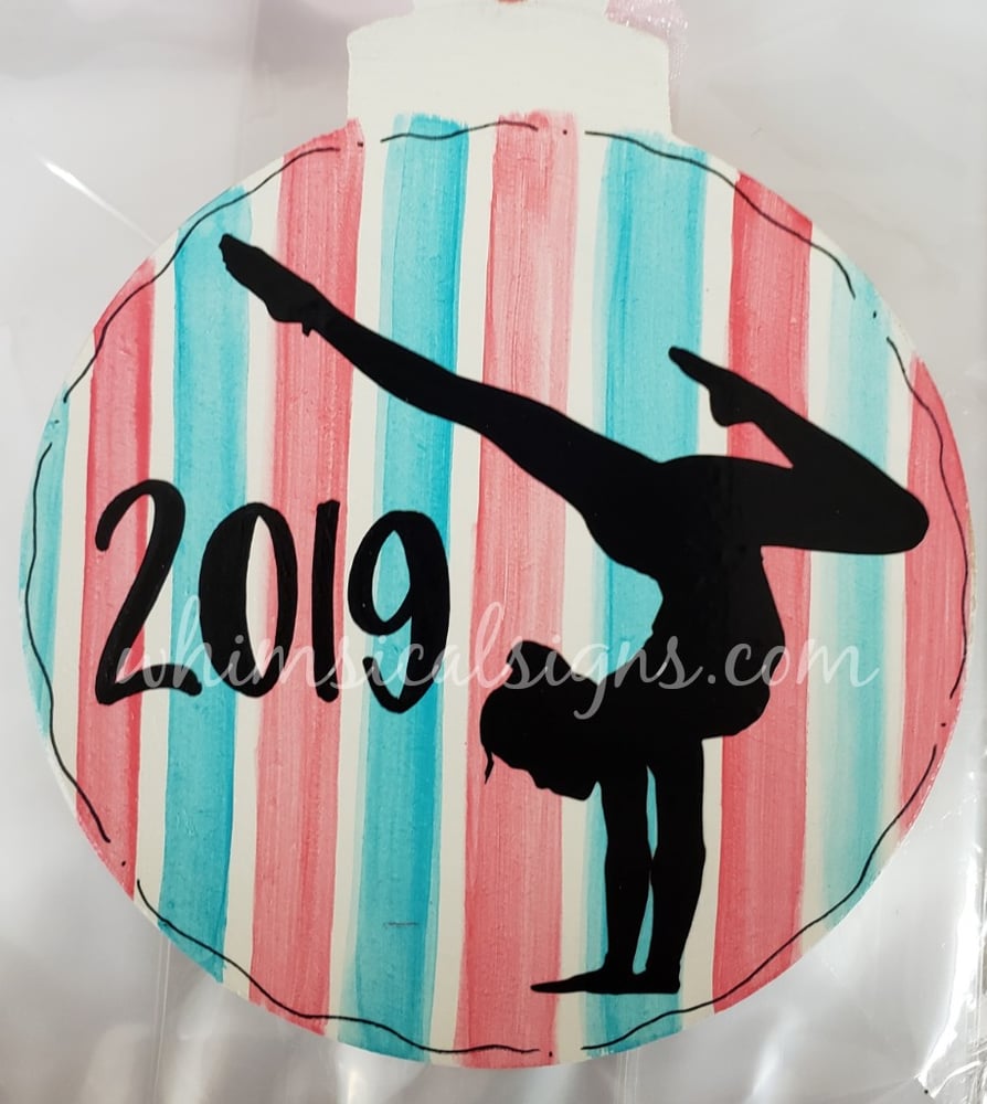 Round wooden ornament measuring 5" across. The ornament is shown in a rose pink and teal blue stripe, but can be painted in your team colors. The name of your gymnast is hand lettered in black on the reverse side. Each ornament comes in a clear cellophane bag for giving.