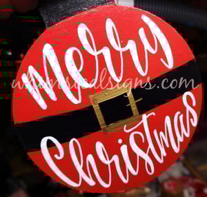 Round wooden ornament measuring 5" across. Painted in a bright Christmas red with a black Santa belt. A name is hand lettered in white on the reverse side. Each ornament comes in a clear cellophane bag for giving.